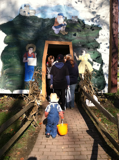 After all that climbing & crawling, we were highly anticipating the trick-or-treating available in StoryBook forest. It was going to give Grey a good chance to practice before the real deal, but it was also an adorably sweet idea (way to go HallowBoo planners). We made it our last stop on the HallowBoo tour, but it turned out that after all that playing and riding- combined with the tons of people, we only stopped a few "houses" before we double backed ourselves up out of there. It would have been a lot more fun if Grey wasn't only 18 months and super tired from all the playing (maybe first stop for next year?)