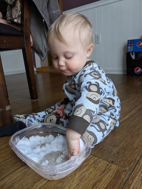 He's learned to caterpillar scooch, then crawl, then stand, climb stairs, and now walk. He's felt the sunshine and wind on his face, grass under his toes, and squished mud in his hands. He's eaten snow, some bark mulch, and licked a pine cone. He's crawled and wobbled over uneven terrain, fallen, ducked under low hanging obstacles, and learned to recognize ledges. He has grown and learned in a natural way in a natural environment where he was able to explore and play freely, even at under a year old.