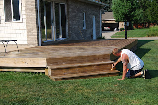 Hahhha, okay, it's not exactly shellacking, but I wanted some [sh] alliteration. After spending a lot of time (and water!) powerwashing the deck a few weeks ago, Brandon spent most of last Friday staining our back deck and it looks great. In the process of making it look great - the stain was also waterproofing! It made a really big difference and I'm so lucky to have a hubs who slaves away in the bright sun:)