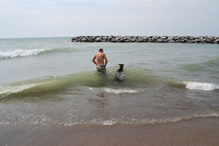 After checking online, we discovered that dogs are allowed on any unsupervised beach at Presque Isle...so we packed up all of Grey's stuff and a very excited pup and headed to the beach! We stopped off at the beach just before Beach8. There wasn't too many people there with lots of space to lay out our towel. While I got Grey ready for his first "ocean"-like experience, Brandon and Bullet headed straight for the water....And Bullet loved it! Brandon waded out to about thigh-high and Bully was actually swimming! He didn't mind the waves crashing right on top of his head or anything! He swam for about 15 minutes and then again for a long while after a little break.