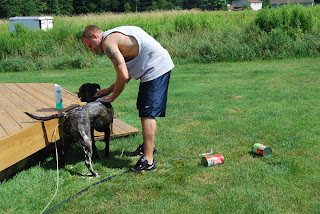 Despite the mess of a day it created, it did allow me to feel guilt-free for leaving him outside while I vacuumed the entire basement and got the kitchen cleaned. Of course, I had to burn incense and candles all day to get the skunk out of the house from the Brandon/Bullet parade that morning. B got home later that afternoon and brought two HUGE tomato paste cans with him. We figured that was probably the least invasive attempt. While he was being washed, B discovered that Bully was really only sprayed on the side of his face and one of his front legs. Thank goodness, the tomato paste worked and Bullet was welcomed back into our house that evening!
