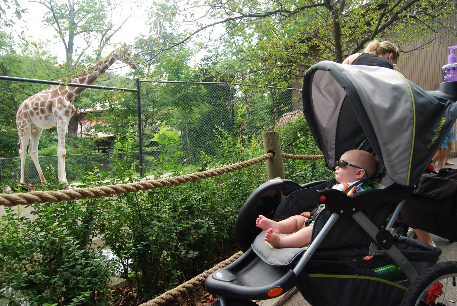 He's definitely not looking at the enormous giraffe in this pic; the little water moat surrounding their pen is a lot more interesting to babies, apparently.