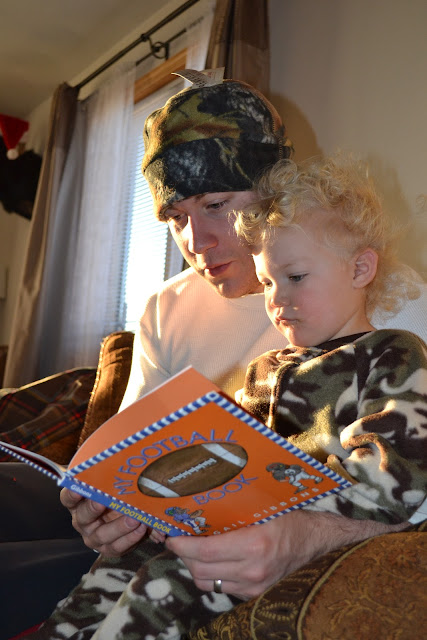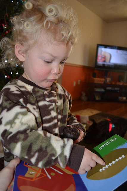 After Booboo's belly was adequately coated in chocolately donut goodness, he continued on his present opening.  The next best thing to an actual football?  Well books about football of course!  (My Football BookTouchdown! My Football Book, and T is for Touchdown: A Football Alphabet (Alphabet Books) ).  They were a big hit...enough of one anyway that then we took a Reading break from gift-opening...which lasted another 15 minutes.