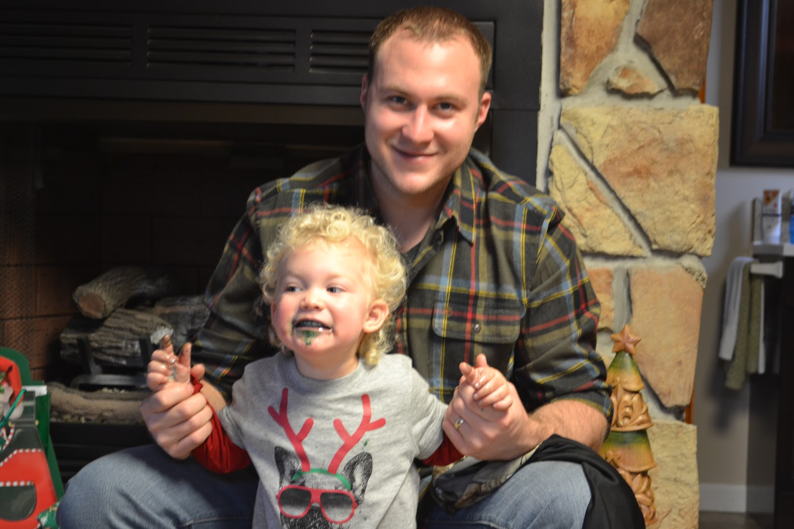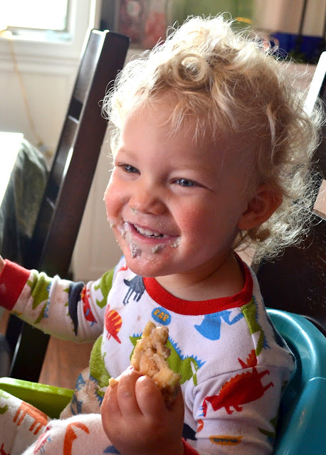 We kicked off holiday festivities on Christmas eve morning with some cinnamon rolls and entertainment supplied by Dadda with a million fake burps in a row which got Booboo giggling so hard that he was squeezing gooey rolls and icing out of his teeth.  Totally disgusting if it was anyone's kid but mine.  sorry if you find this picture gross, its adorable to us.