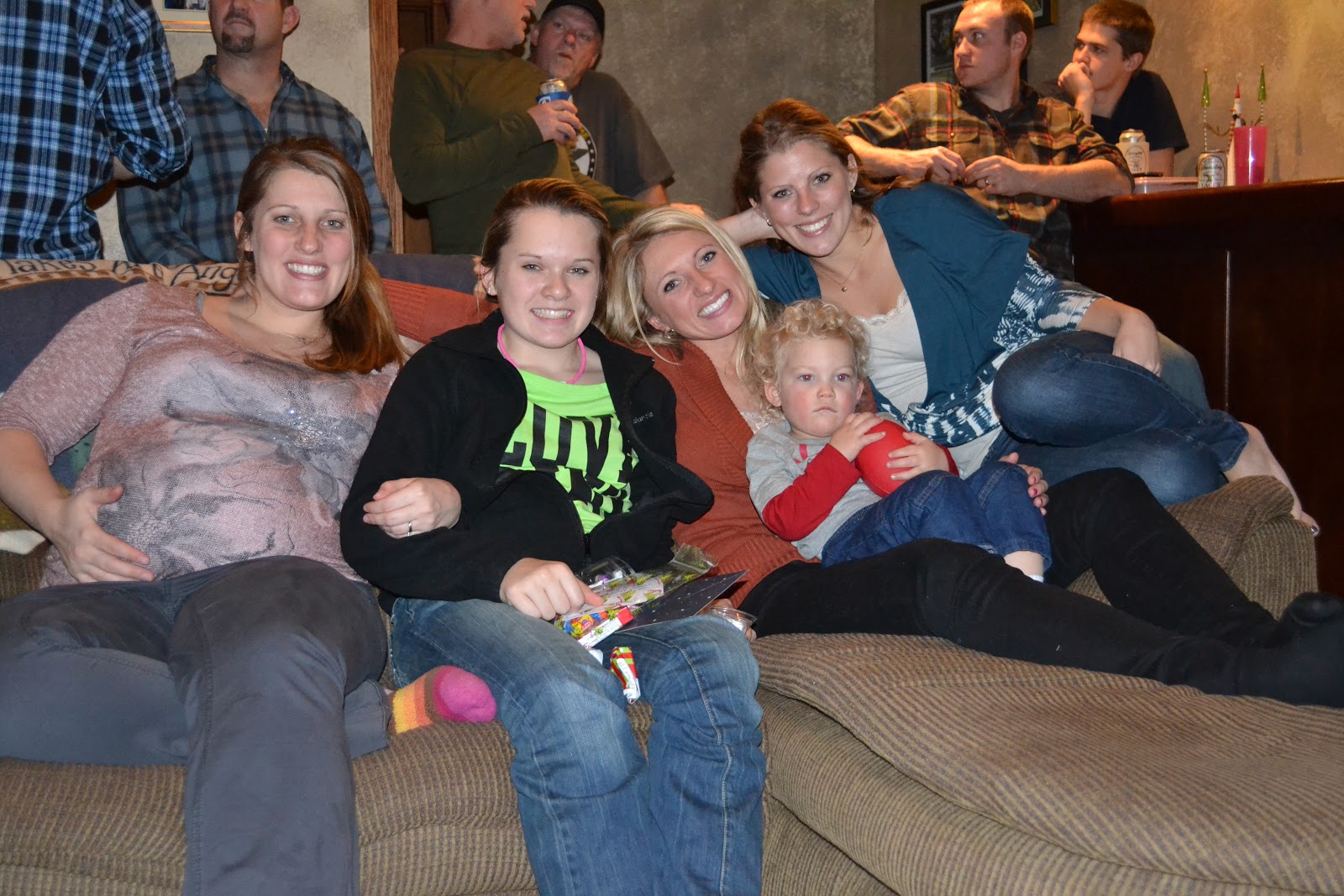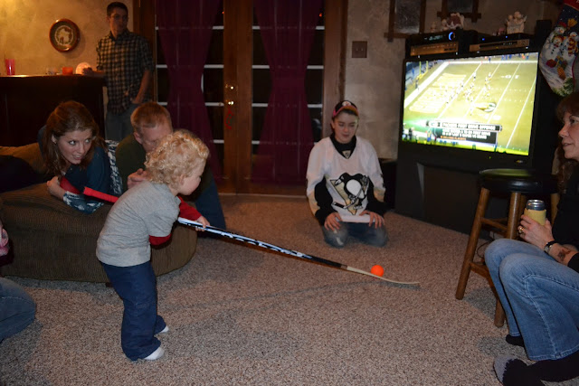 But even after all that Christmas cheer on the 25th, we still weren't done with the merriment.  We headed over to our family friend's house; the Siwy's, for a Christmas day finale.  Grey was so pooped from the day that he laid unconscious on the couch for about an hour when we got there - totally oblivious to all the poking and attempts to wake him up.  He finally woke up and spent the rest of the evening playing hockey with Bryce and watching football...which is basically his favorite two things on earth right now.