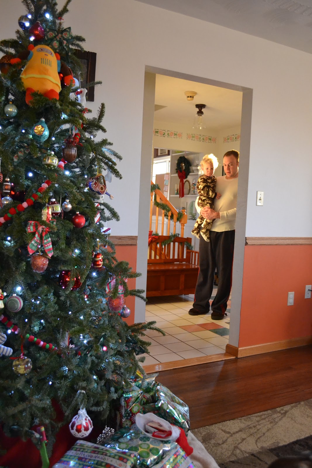 why is there a robot in our tree?  Brandon hides Grey's stuffed animals in there.  There is also a stuffed football, an alpaca, and Gee the monkey in there too.  Grey found them all and then asked them each, "whayadoin?"