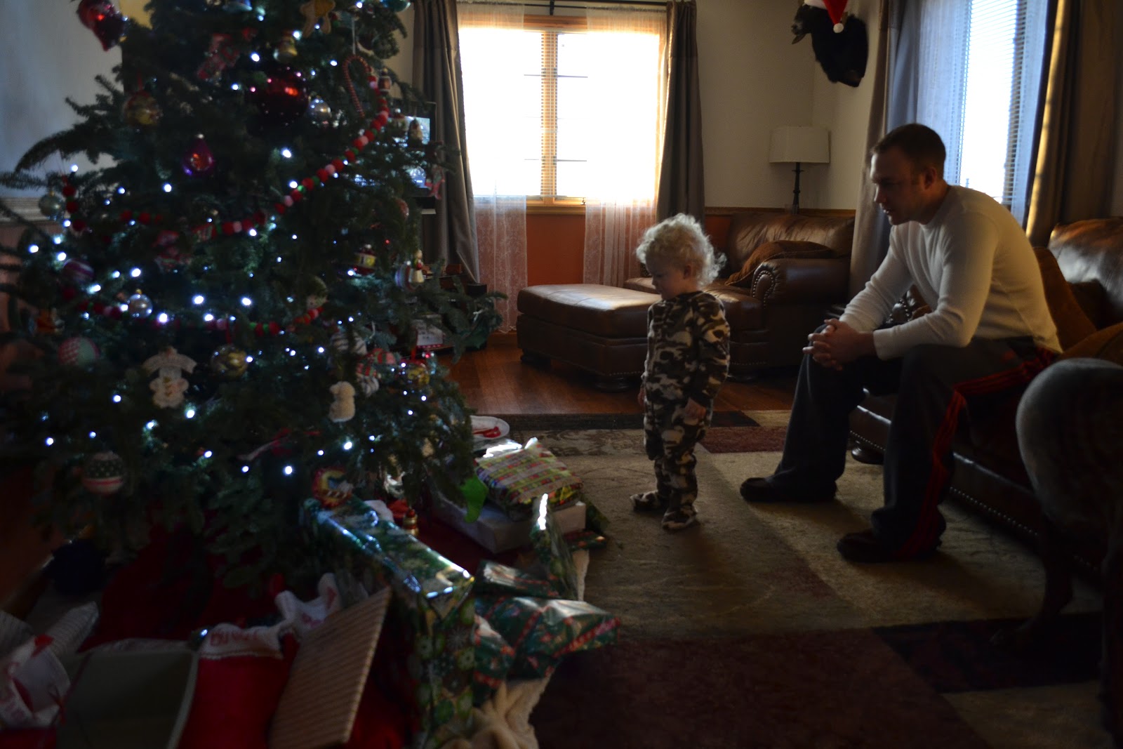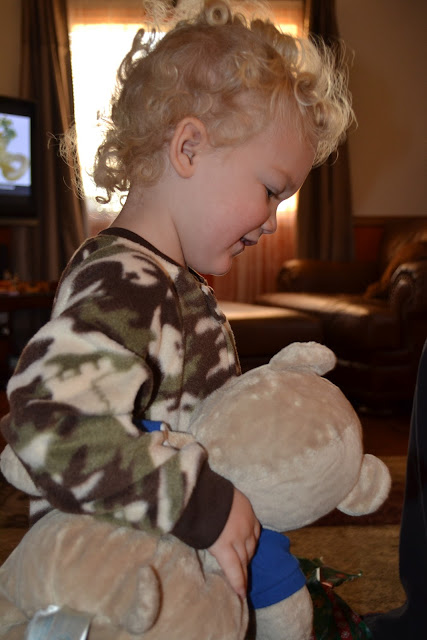 Now it's confession time, I'm a chronic early Christmas morning riser...like 5am riser.  I can't help it, this happens every single Christmas and I'm not even excited about opening my gifts..I just love the excitement of the day and the prospect of delicious breakfast and wrapping paper on the floor.  I understand this is totally lame and I should be happy to sleep in as long as possible...alas, I was up at 5:15a staring Brandon in the face breathing hot air on him until he groggily opened his eyes and said, "maybe we should let Booboo sleep since he went to bed late."  And then I huffed about and went downstairs and ate cookies and stared at the tree for THREE and a HALF hours, until my two sleepy guys awoke from their slumber.