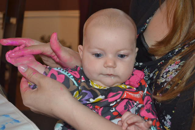 I bought canvas aprons (they come in a 3pack from Michaels!) and some fabric paint. Then we set to getting the kids all messy to put their handprints on our aprons.