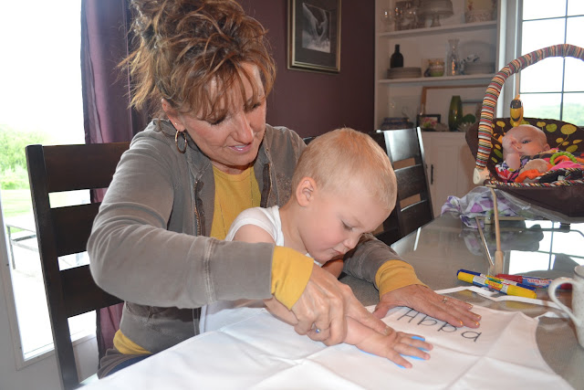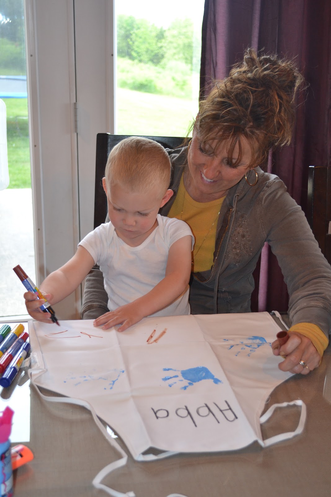Once the aprons were spotted with the kids' handprints, we added their name and age to one of the prints for posterity's sake. They looked cute enough like that, but we weren't through just yet. Grey used fabric markers to color on the aprons to add a little more pizzazz. And I wrote our "names" on each (aka: Mum, Abba, and Gigi)