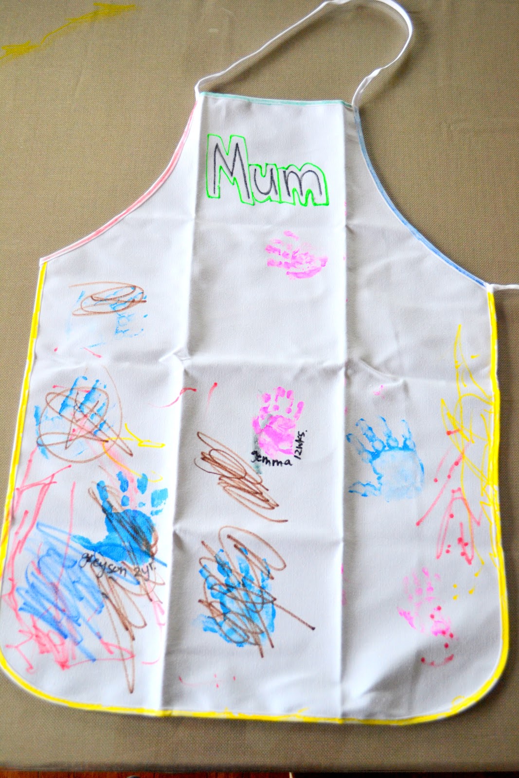 We'll see how it goes for next year, this might be a project we come back to and re-visit to keep adding handprints each year? In any case, the aprons look adorable and it was a fun project that kept us happy and busy while we waited for our Mother's day feast.