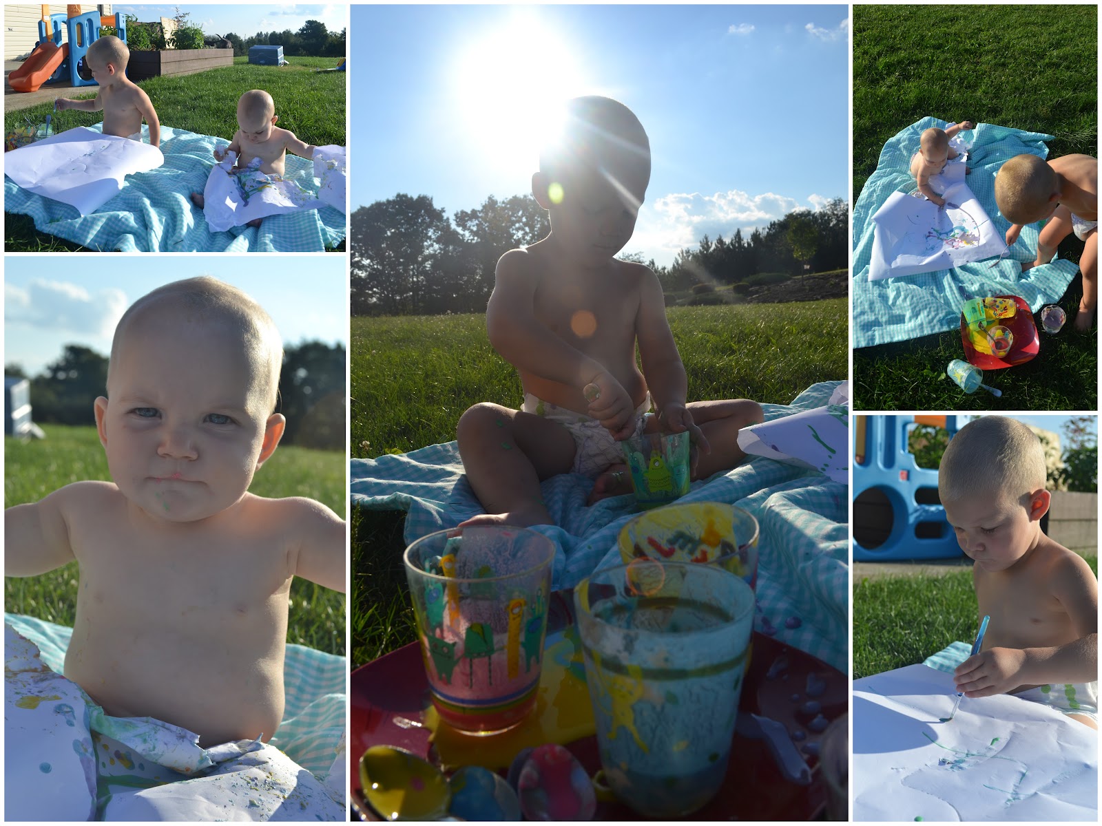 We ended up doing this task a day after my birthday since we were all exhausted when we finally got back home on Sunday. The edible paint (flour + water + food coloring) came from this pin and looked like a great idea. And at first it was, what with all the sun shining behind the kids and happy, busy children focused on a task.