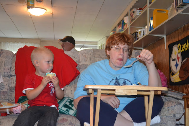 We stopped by my Aunt's house to have a mini birthday party with my cousin Amy. Amy is a 'happy birthday song' singing extraordinaire and loves parties and cake. (Amy has actually forever re-wrote the way we sing happy birthday. Because of her enthusiasm, we always say "SING" after each verse, because Amy knows every person should be singing and as loud as possible during a birthday party). We had a nice little break during our mini party from all of our kind tasks and somehow (as it usually does in Johnstown) it turned into celebratory shots at noon. You'll have that in our family.