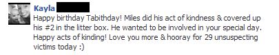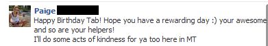 I wanted a chance to use my overload of facebook friends for the good. So I posted my project first thing in the morning and periodically sent pic updates of some of the acts. My intent was to inspire other people to join in on the kindness distribution. I hoped I was going to get a response - I didn't expect the response to be as amazing as I got. Thank you so much to everyone who helped me celebrate my birthday by acting out random kindness. I could not have asked for a better gift and I am so proud and honored to know so many good people.