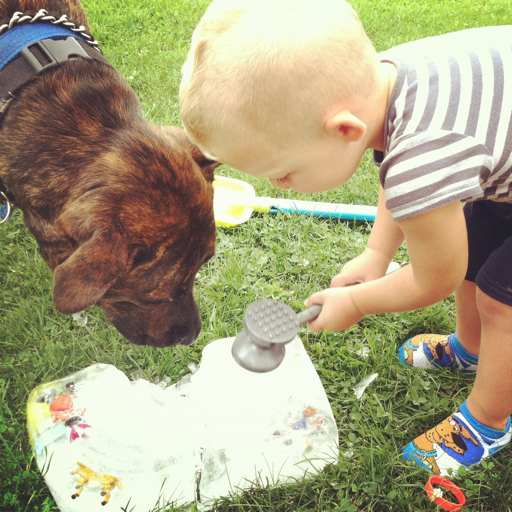 this great idea of freezing toys in ice and letting my child 'bang-bang-bang' it out. For a hot afternoon with a little boy that wants to copy his daddy - this was a real grand slam of an activity. The dogs were so interested in Greyson's ice block treasure that it inspired me to create one for them with treats frozen in it