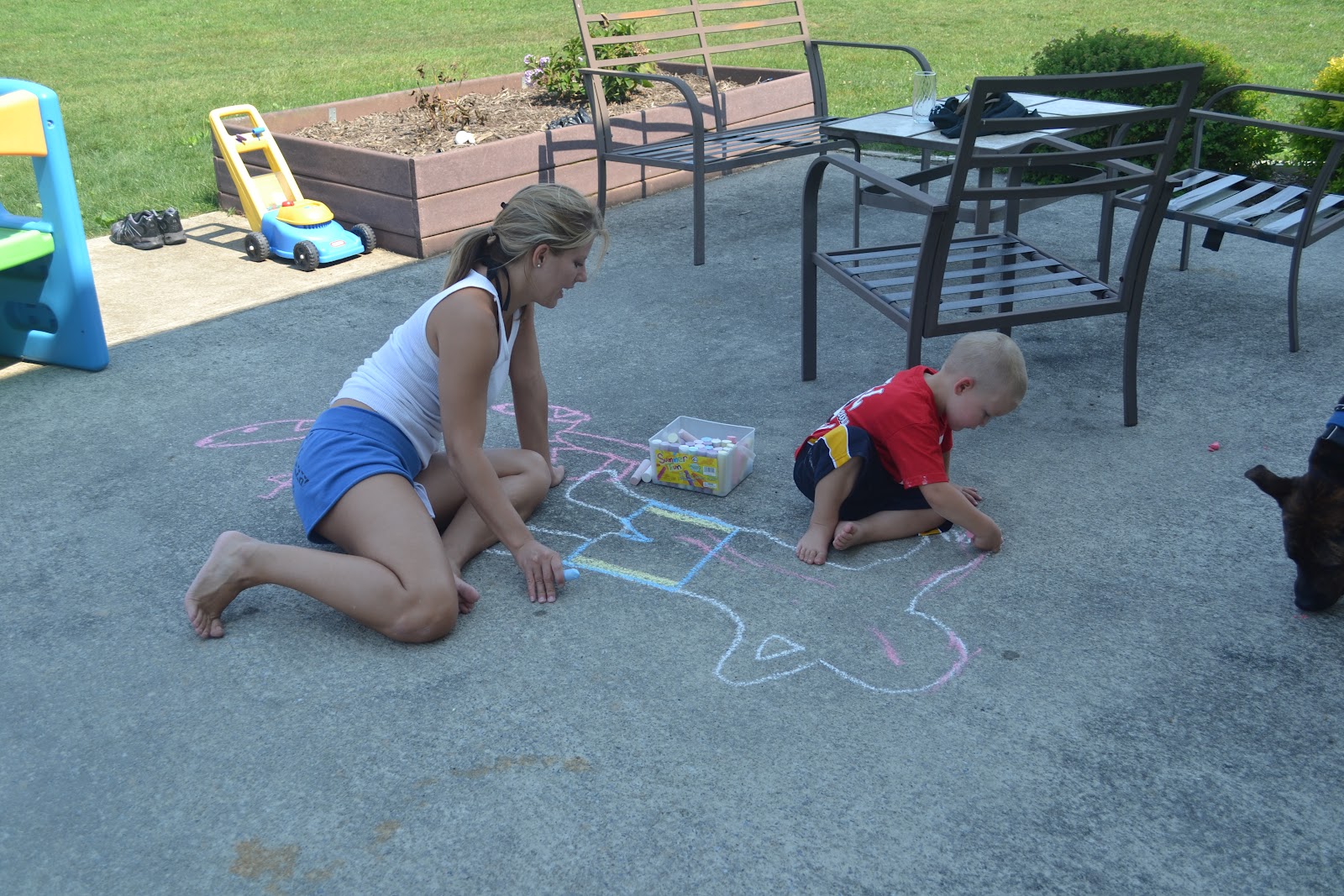 39. Side walk chalk: we did this all summer long. we made lots of snake bodies, outlined our bodies (and the dogs' bodies), we made curvy lines that we walked on like roads, and shapes to jump into when we called out their names.