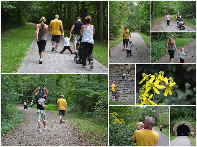 2. Walk Staple Bend Trail (local walking trail): This is a local trail near my parents' house that is a 4 mile walking trail. 2 miles to the historic Staple Bend tunnel and then 2 miles back. We enjoyed the scenery, sword fighting with giant sticks, sneaking through the tunnel, and even climbing the cement blocks outside the tunnel. We even caught a quick chat with my high school friend, Jackie (hi, Jackie!) as she was jogging the trail.