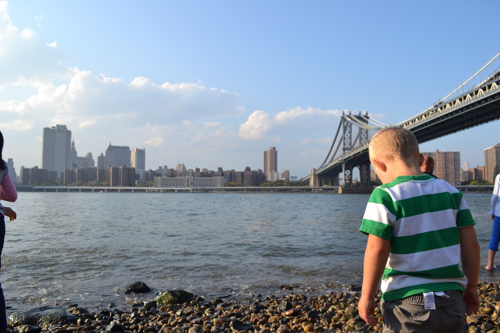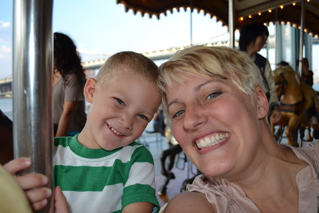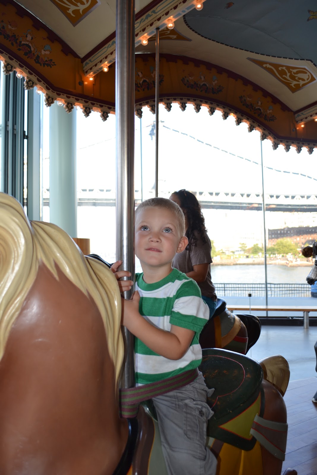 After lunch and another quick train ride, we made our way to the Brooklyn Bridge. Grey threw stones in the East River, and we took a ride on the carousel (Lenny, Grey, and I).