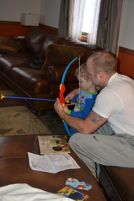 So, I guess this is a good time as any to inform all of my non-family/close friend readers (that don't already know this firsthand) that we have a situation right now that Grey is sort of obsessed with weapons. We do a whole lot of talking about how we a) don't shoot people, b) we don't shoot in the face, c) guns are dangerous, d) swords are dangerous, e) we don't hit too hard, etc, etc, etc, etc. So, in any case - after all that, Grey does know that we (as in his Daddy, Grandpaps, and uncles) shoot animals - mainly bucks & bears. So when you see pictures (like a lot of them) that look like the one below, please don't be alarmed - Grey asked demanded the necessary: "Daddy, be a buck!" beforehand.