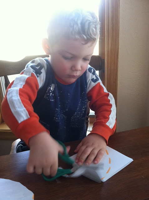 One of my almost three year old boy's favorite activities is using his little scissors to cut paper into tiny bits that fly everywhere making impossible messes that I continue to find days later. So one day recently, I attempted to hone that love for cutting into an actual skill and had him start to practice cutting things in straight lines and along curved dotted lines.
