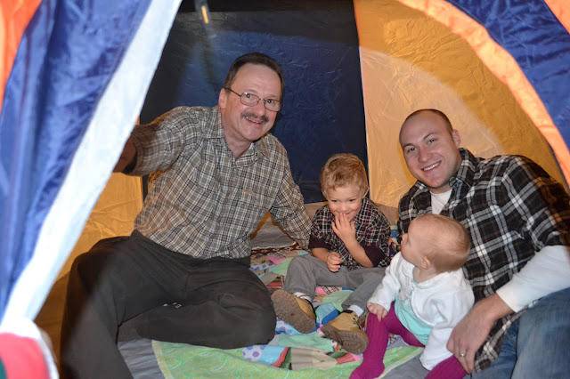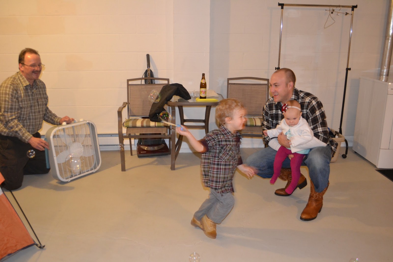 we visited with Gigi's brother; our Uncle Joe & Aunt Ginger. In a matter of 45 minutes, we had attempted to fly a remote helicopter, built & played in a tent in the basement, blew bubbles with a large fan, fed a cat outside, shoveled the driveway (for fun!), opened gifts, ate candy, and climbed into the attic. The kids had a blast and we're thinking that maybe Uncle Joe & Aunt Ging need to be on the babysitting agenda asap because it was so much fun that Grey is still talking about it. (hi Aunt Ginger! We're not kidding!)