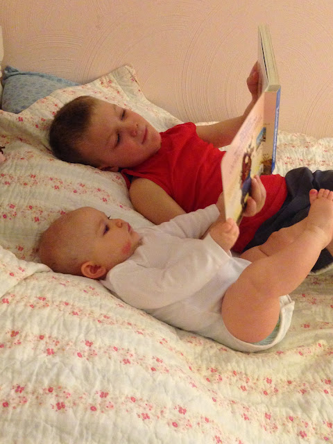 Someone recently asked me how many books I thought I read to my kids each day, and I responded unfazed with, "Maybe like between ten and fourteen," which I didn't think at all was that weird until I saw their expression which was a mix of disbelief and confusion.  Reading books is something we do well in our house.  Granted, there are several things we don't do well (like using beds for only sleeping instead of launch pads into piles of blankets and pillows while the adults in the house repeat over and over, "Please stop jumping off the top bunk and clean up that mess!" but that's a different story for a different day).