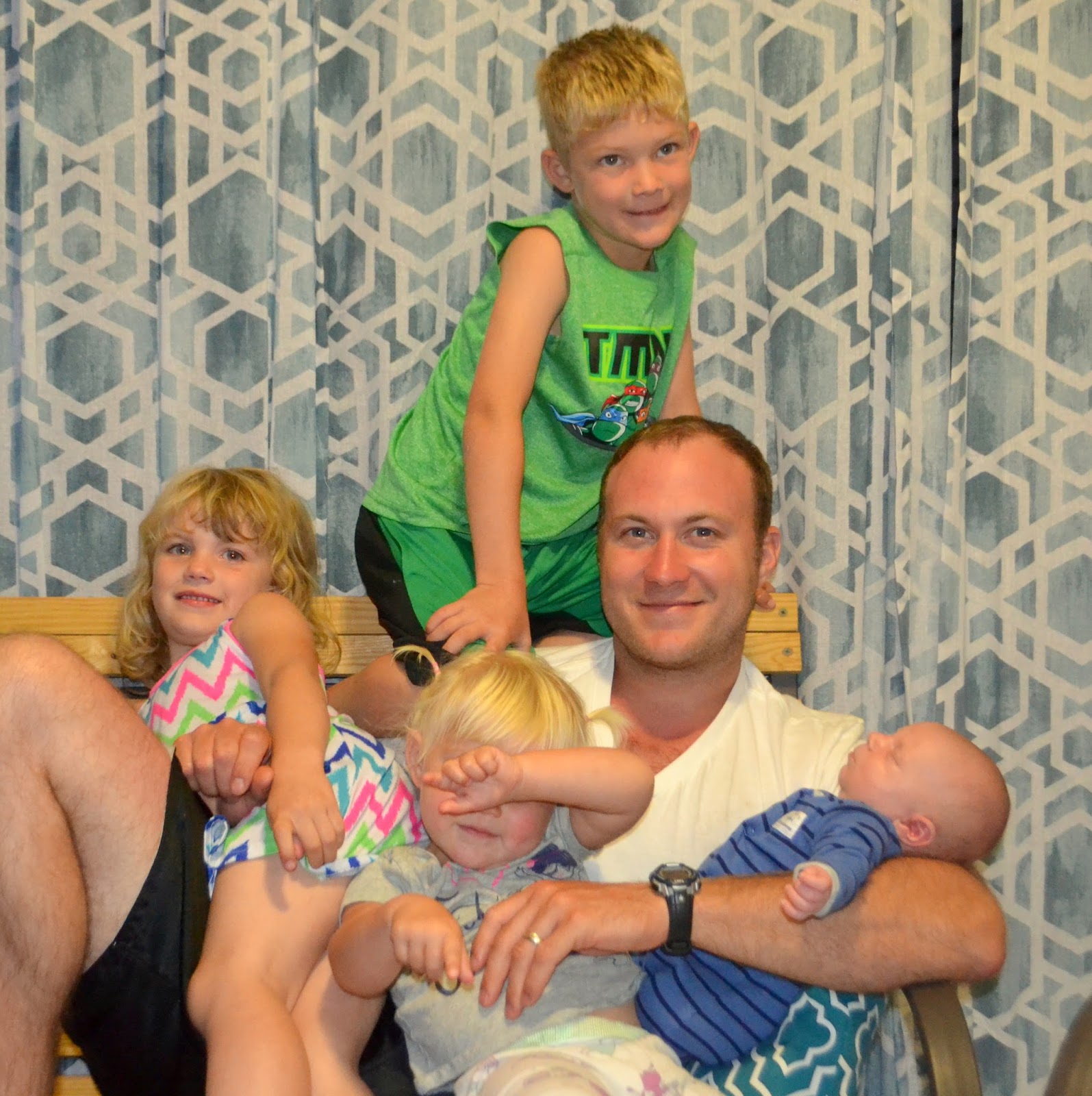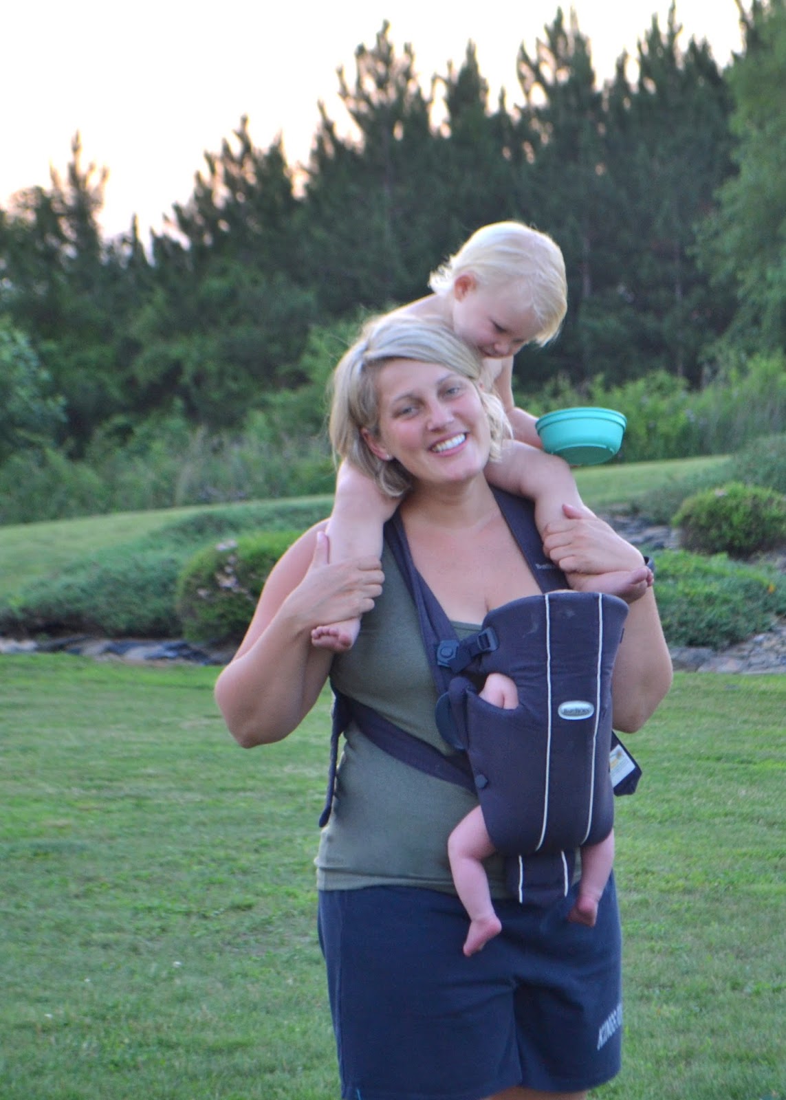 So aaaanyway, the other day, when everything was going to crap around 7:30p, I took our screaming, gassy three week old in the bjorn carrier and put our very cranky 21 month old on my shoulders outside in the warm evening air and did about 27 laps around our backyard.