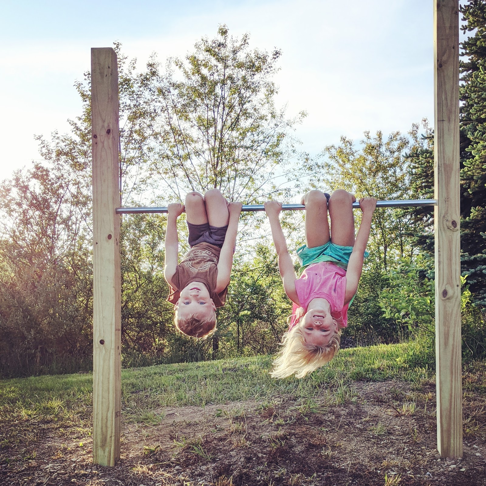 Working in the yard. Abba and Chum came for the day to work on the chin-up bars for the kids. Brandon, Butter, Pappy, and Chum all worked on finishing the goat fence. Gemma was such a big help all day too - she loves working with her Dad!- and they finished the whole thing and got the entire pasture enclosed. One step closer to bringing home the goatie goats!