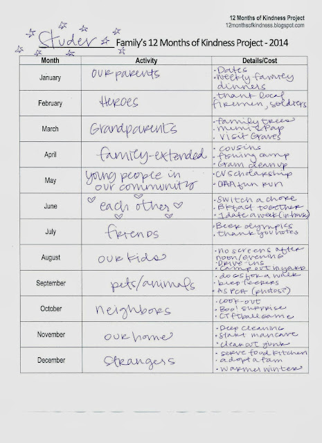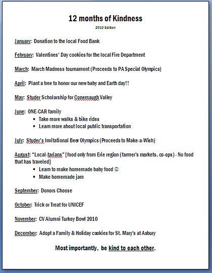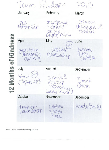 After my husband, Brandon and I got married it felt kind of lonely realizing that we aren't at the age anymore where volunteer groups or opportunities abound...So we decided as a family that we would commit ourselves to 12 acts of kindness throughout the year to various organizations or causes. It also has something to do with the fact that I can't just pick one thing that I care about...just about everyday I pick up a new cause that I want to help...so from this our tradition of 12 months of Kindness was born.