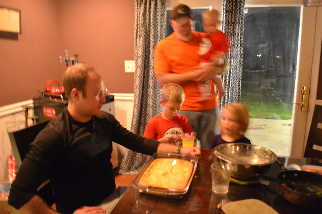 So, I got to peeling, boiling, and mashing potatoes from scratch, and finishing the rest of dinner:  three- packet slow cooker roast, steamed veggies, mashed potatoes (!the real kind, not by choice), and rolls.  We had cheesecake for dessert (B's favorite) and sung happy birthday while we laughed and talked around the table and the kids played under the table their strange spy kid games of make believe.  Gosh, do I love those kind of dinners that nobody feels like getting up and being done.   I hardly took any pictures at dinner because I was too busy participating and enjoying dinner (!) but I caught a few blurry ones of the big birthday singing.