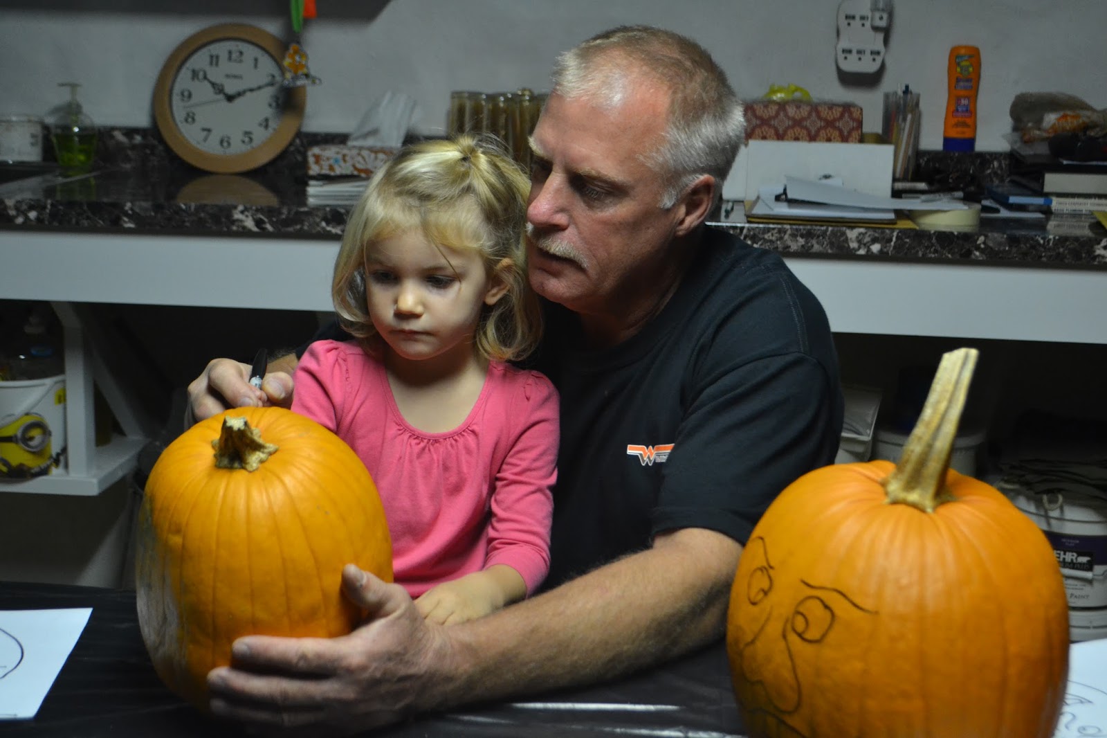 Abba and Chum's house is always an adventure!  We had dinner and then my Dad took the kids in the basement to do pumpkin carving with them (one of my least favorite halloween events, so thank you Dad!!!)  Chum called my mom and I downstairs to see how the kids first drew a practice face on a paper and then how that translated to their drawing on the pumpkin = tiny little faces drawn.  It was the cutest and we were all smiling and laughing.