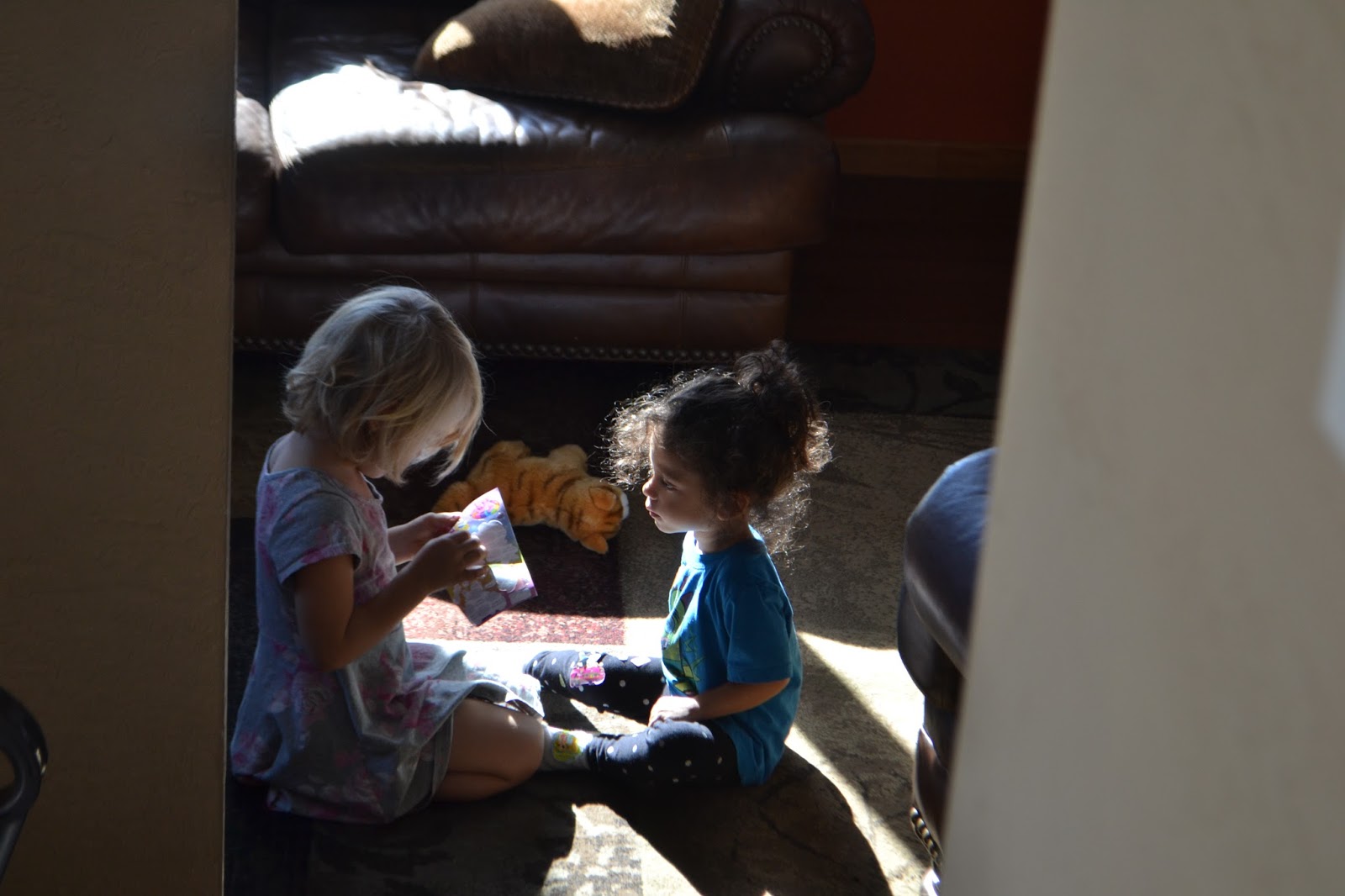 After several half-attempts both by Grey himself and me, we settled on neosporin and a band-aid until the afternoon when we would have more time (and patience!)  Then he dried his crocodile tears, got a few hugs and he was off to school.  whew, I was all like, please tell me it's after 9am at least. um, no.  So the girls and I got breakfast, got ready for the day, and started tackling chores and playtime.  The girls were playing so nicely that I got a chance to sneak in a hot (super quick!) shower and it's amazing what clean hair, fresh lipstick, and a dance party while folding clothes can do for a person's psyche!