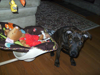 *As much as I would like to take credit for this ingenious technique for preparing the pup for the babe; I borrowed the idea from a therapy dog video I searched on youtube. This is how they prepare dogs to go into hospitals to work with patients by getting them accustomed to unusual pieces of equipment (i.e. crutches and walkers).