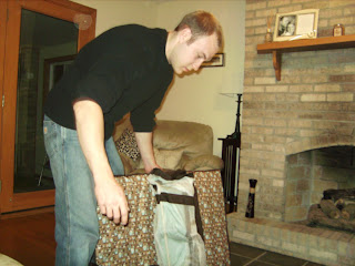 Our house is slowly getting baby-ready. B and I started putting together the fifty million baby accessories we got for our shower (thank you everyone!) Well, B is putting them together and I am reading instructions. Bullet is helping by ripping the cardboard off of everything to get it opened. We've already assembled the high chair, playpen, and swing. They are all so cute and not too bad to put together. We left the high chair and swing up where they'll be in the house (even though we still have 2.5 months to go) so the animals get used to them being there.