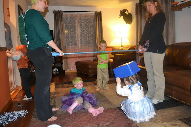 Then it was time for our 'Witch's' Broomstick Limbo game. We had the kids sneak under the broomstick for a little while and then moved to the much preferred preschool version - Reverse Limbo by having them jump over the broomstick instead.