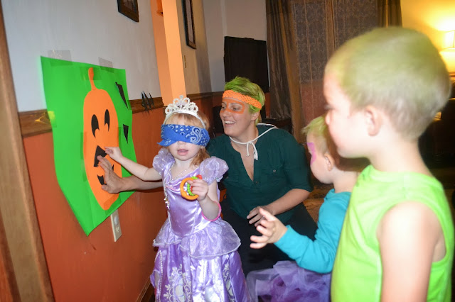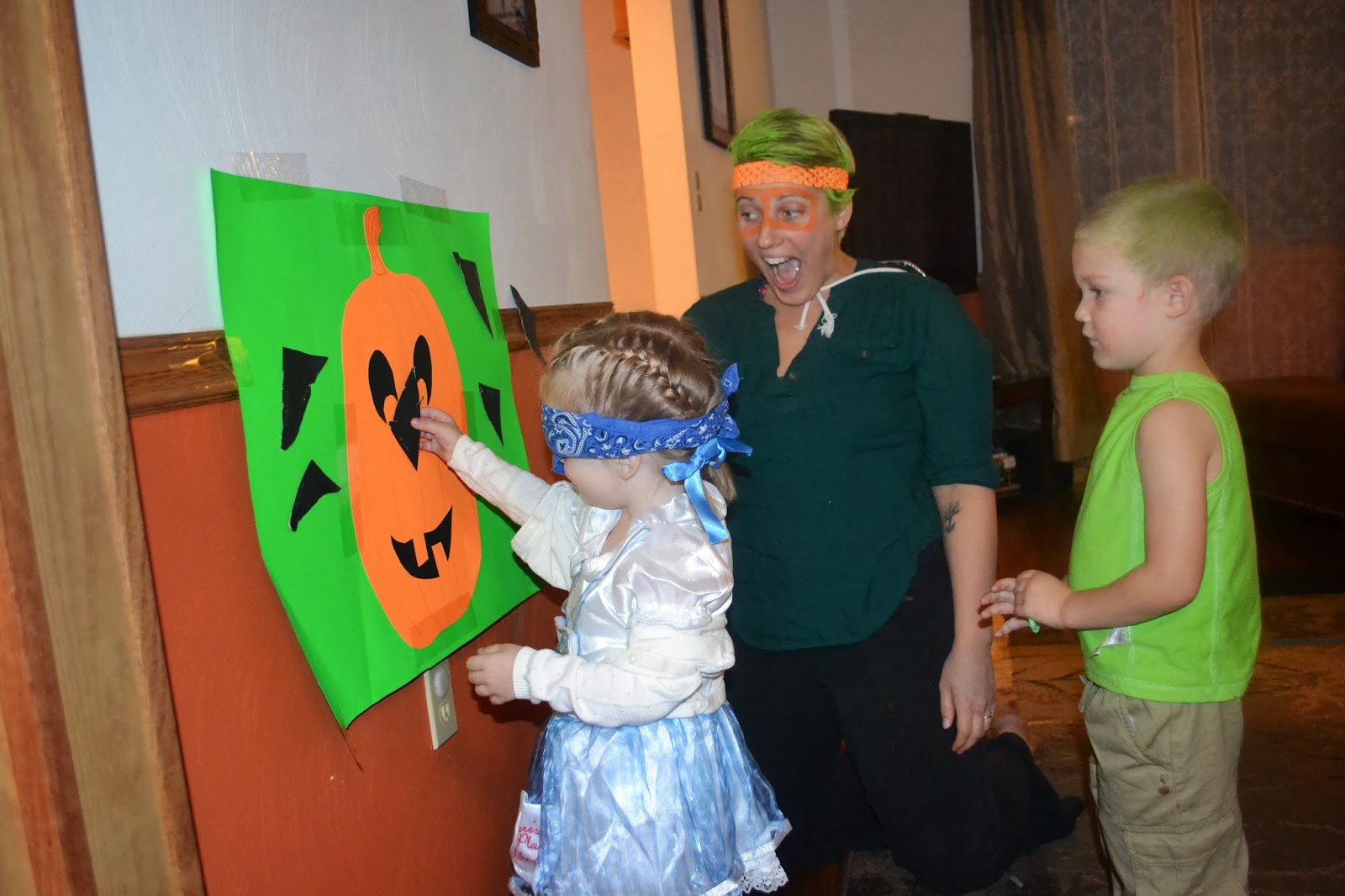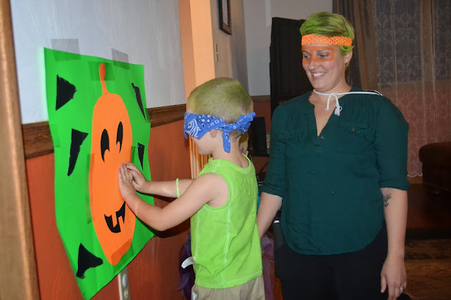 After pizza and snacks, we made our way to our first game of Pin the Nose on the Jack 'O Lantern. Earlier that afternoon, while I cut out the pumpkin face, eyes, and mouth; Grey was in charge of cutting out the noses, so he was proud to have helped get the game ready. The kids were blindfolded with a handkerchief and spun around three times before trying to pin the nose. This game was a huge hit and we played it several times in a row. Even our < age 2 guests (Gem & Lila) enjoyed playing this game!