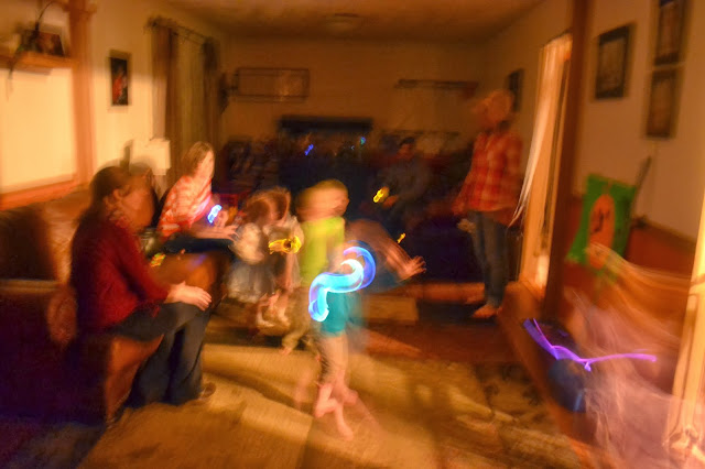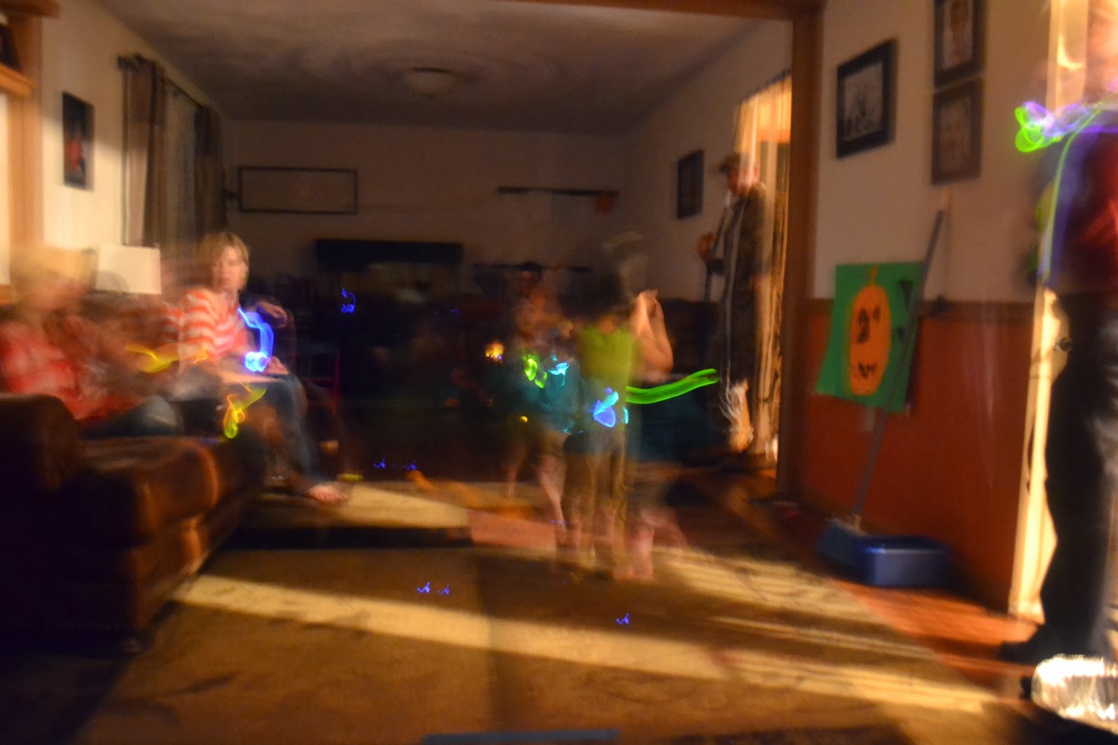We made our way back into the living room to jam to a Pandora Halloween station, turn off all the lights (except we kept the hall light on, keeping it just spooky!), and handed out glostick bracelets. The kids ran and danced all around making spooky noises and screams. A Spooky Glo-stick Dance Party = wild child mayhem fun!