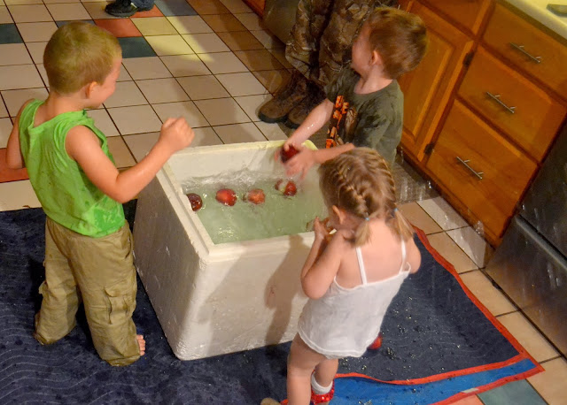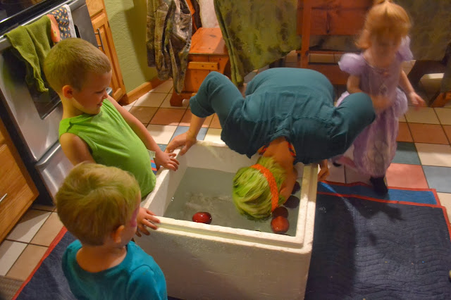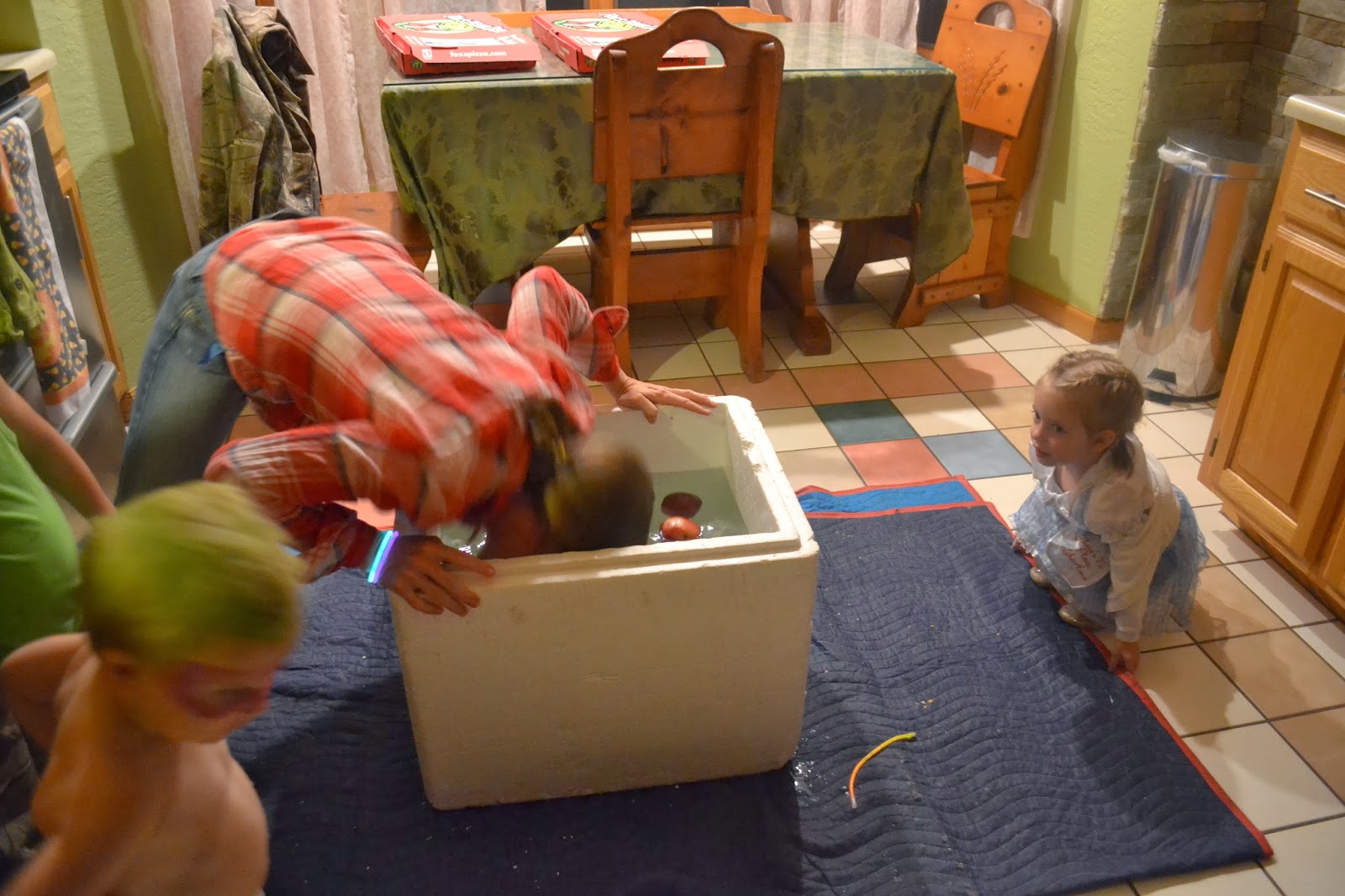 Our last event of the night came straight out of our last year's Halloween party playbook. We filled a styrofoam cooler up with water in the kitchen and lay a moving blanket underneath it. First the parents get a crack at Bobbing for Apples and have you done this recently? It is always significantly more difficult than I remember in my teenage years. Serious water up my nose this year.