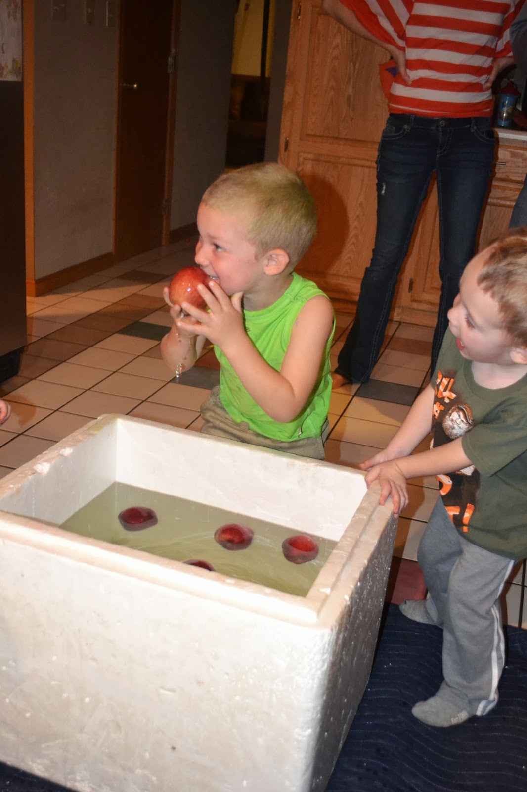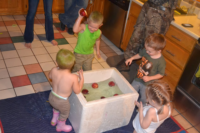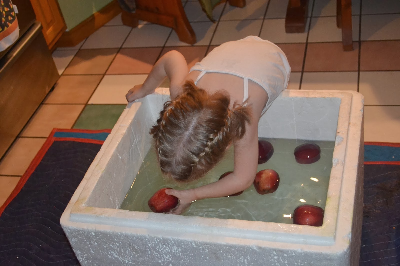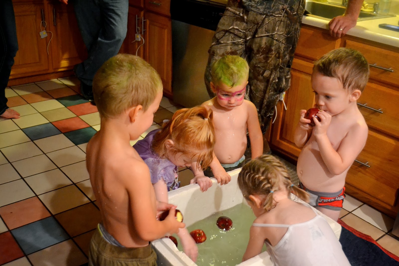 The kids think its funny (and sort of cool still, yay!) to watch us grown-ups bob for apples. Grey and Sophia tried to do the same and Grey actually grabbed an apple by it's stem with his teeth! Soph went for the more traditional preschooler move of the secret hand-grab (hehheh).