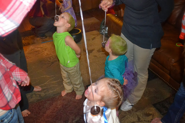 Our next game is a pinterest-halloween favorite, The Dangling Donut Game: so we'd thought we'd give it a try. With a menu of pizza, snacks, cookies, and loads of candy - the last thing I wanted to do was give the kids full size donuts to eat. So we tied mini donuts to strings to have the kids try to eat through them on a string. This game was a lot harder for them than we thought it would be and for a long while all the grown ups were cracking up while the kids just bopped the donuts off their faces over and over. We might try this again when the kids are a little older (5+) but for now, it seemed a little tricky and an unnecessary addition to their already major sugar consumption for the evening.
