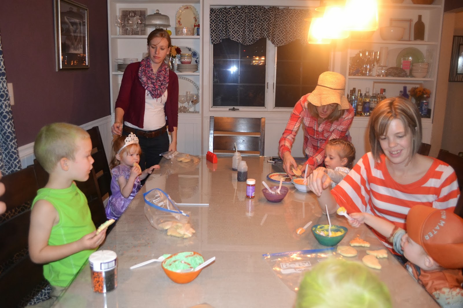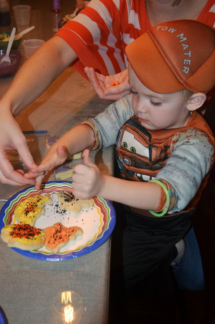 Then it was on to cookie decorating in at the dining room table. The kids and I had made a batch of sugar cookie dough the day before and made Halloween shape cut-outs to have them ready for the party. I also used my Grandma's famous boiled icing recipe. Each kid got five sugar cookies to decorate as they liked - which ranged from no decor (and just straight into their bellies, hah!) to a ton of icing and even more sprinkles.