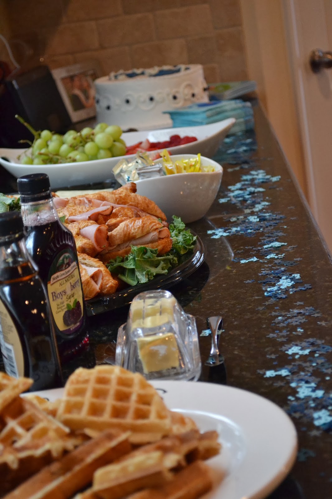 On Sunday, we all got up bright and early and got to preparing for Baby Shower day. Traditional shower would be from 11am until 2pm with an hour of rest before the start of Virtual shower time slots scattered between 3pm until 6pm. We were all set and ready to go before anyone arrived. We had light brunch fare of waffles and croissant sandwiches with some desserts and a beautiful cake brought by the Grandmother-to-Be.