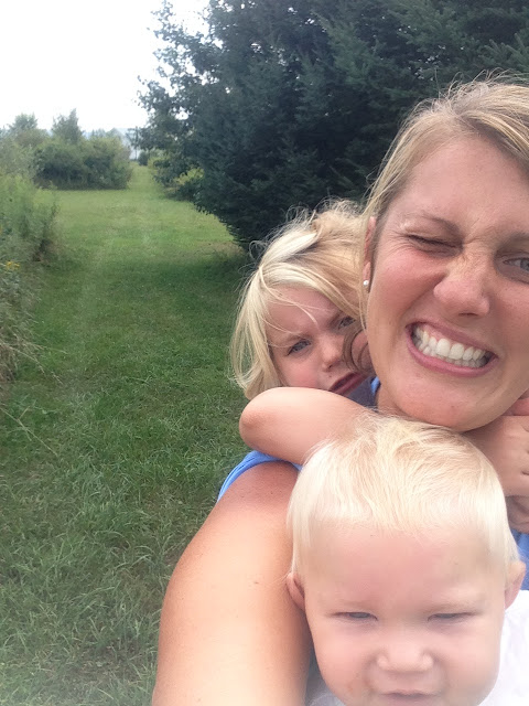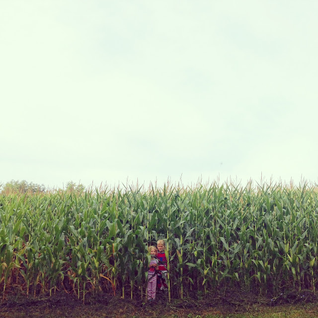 And walking here behind our house through the woods and cornfields. Jogging with a happy Bully-Boy. Walks with the kids are always a big lower-back workout for me with Violet-too-heavy-for-the-carrier in the carrier up and down the hills. Sometimes with Gemma on my back even because: threenager, my legs are too tired. Thanks to Grey and Caleb for helping her get through it - hah.